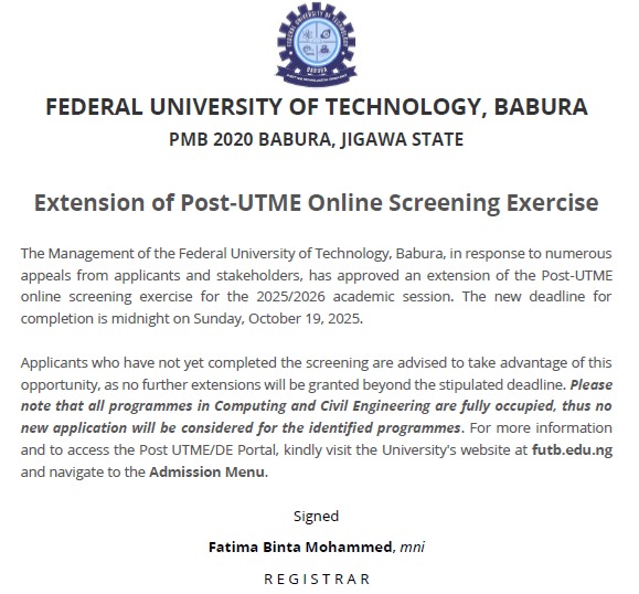 The Management of the Federal University of Technology, Babura, in response to numerous appeals from applicants and stakeholders, has approved an extension of the Post-UTME online screening exercise for the 2025/2026 academic session. The new deadline for completion is midnight on Sunday, October 19, 2025.
